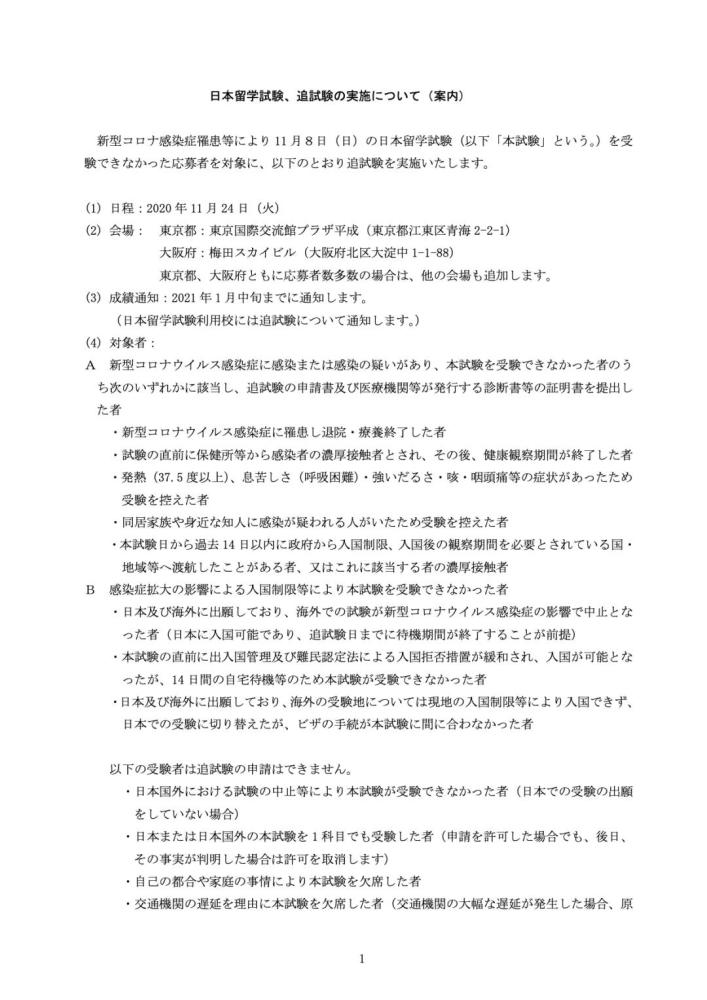 考虑到受新冠肺炎的影响,未能参加8日日本留学生考试(EJU)的考生,凡是符合以下条件者,可申请追加一场考试资格!